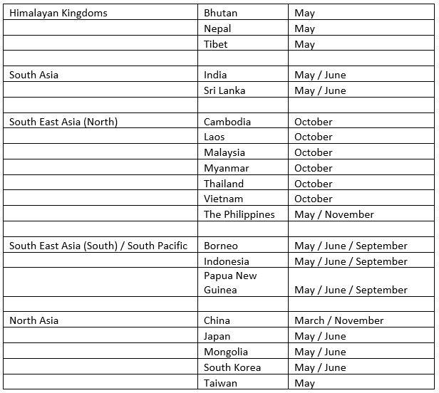 If you’ve read this far, you might have guessed that we are building up to some sort of a list to try and decide when really is the cheapest time of year to visit Asia. I have tried to apply a sort of scientific approach with this list, splitting Asia into five regions and listing the countries under each region.