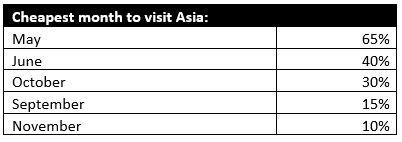 We like to think we know a thing or two about Asia, but there are two questions we get asked a lot which are always a challenge to answer well: When is the best time to travel to Asia? And when is the cheapest time to travel to Asia? In this blog I will try to tackle the difficult question of when the cheapest (or best-value) time to visit Asia is. To do this, we need to look closely at airfares and hotel rates.