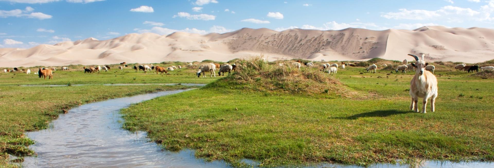 Also in the area is the rejuvenating hot springs of Tsagaan Sum with an adjoining ger camp. Taking a long soak in the therapeutic waters is the perfect way of relaxing after a day's adventure in the jeep, or on saddle. This is the area of Mongolia where you may see the most gers and horse breeders and you will have the chance to visit a family and try the national drink airag, which is made from fermented mare’s milk. The ger camp is set in a stunning location surrounded by meadows and farmland with horses and yaks grazing in the background. As well as standard gers, this camp has deluxe gers with en suite bathrooms.