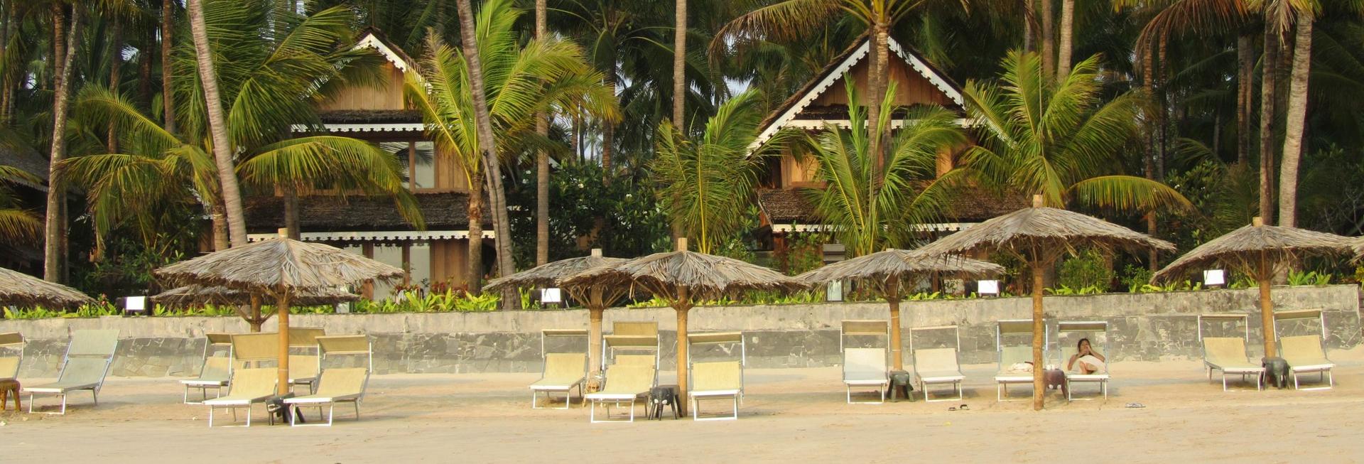 On the southern part of the beach, set amidst coconut groves that lead directly on to the white sands of Ngapali Beach, Sandoway Resort is the most fashionable resort at Ngapali Beach. Original in design and built in traditional materials the resort offers 37 air-conditioned rooms in 5 different room categories. There are 5 Beach Front Cottages, 10 Village Cottages scattered in the garden (some with partial sea-view) and 22 Deluxe Rooms in the main complex. Next door there are also 10 Sandoway Beach Front Villas and 8 Sandoway Sea View Villas. Each of the rooms has modern amenities and a private bathroom. There is a telephone in each room but no TV. Hotel facilities include 2 open-air restaurants with verandas overlooking the beach, a bar with a piano lounge, a large swimming pool and a spa. Snorkelling equipment, bicycles and catamaran boats are available to rent.