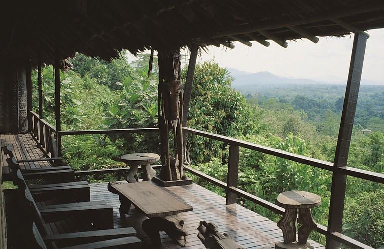 Standing majestically on a lone ridge, 300m above the banks of the Karawari River and overlooking an endless expanse of dense tropical lowland rain forest is Karawari Lodge. One of the most remote and un-spoilt destinations in Papua New Guinea - the lodge's private airstrip, and the Karawari River, are the only way in or out. Guests are accommodated in ten separate cottages, each built out of local bush materials and inspired by traditional architecture. Each cottage has two private twin rooms, each with modern en-suite bathrooms, and a communal veranda. Despite its remoteness, the lodge has 220V electricity, hot & cold water, comfortable mosquito-netted beds, ceiling fans, and a breezy veranda. The dining and lounge areas, 'Puk Puk' Bar and a vast collection of Sepik artifacts are housed in Karawari's main lodge building, designed and built in the form of a traditional 'haus tambaran' or spirit house. This tropical lowland rainforest around the lodges houses an immense variety of flora and fauna - a staggering 229 different bird species have been recorded at Karawari. Optional early morning / late afternoon birding is available at no extra charge for opportunities to spot elusive twelve wired birds of paradise, cockatoos, parrots, hornbills, cormorants and other water birds.