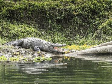 Crocodile, Chitwan National ParkFull day wildlife excursions: There are several wildlife excursions to choose from today, starting with an early morning bird watching tour. After breakfast the most popular activity is a jeep safari in the National Park, to explore the jungle and open grasslands in search of a variety of wildlife. Your driver and guide will take you to the best places to spot animals, and talk with the local rangers to find out if any animals have been recently spotted. The guide will also provide information about Chitwan’s environment and the wildlife. After lunch back at the lodge you will have the opportunity to take canoe ride down the Rapti River to spot wildlife and birds, finishing with a short trek through the forest and visit to a crocodile breeding centre at the National Park HQ. An alternative option is a visit a local village to interact with the Tharu people that have inhabited this area for centuries. Please note that these excursions are operated by the Jungle Villa Resort and are on a shared basis with other guests staying at the lodge.