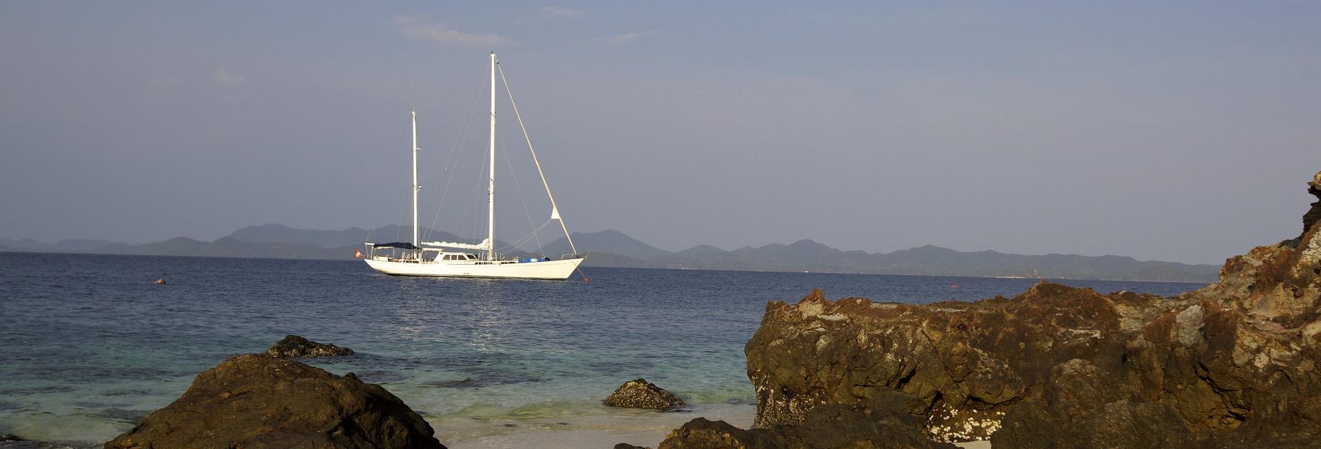 Yacht, Mergui ArchipelagoSailing adventure around the Mergui Archipelago: Enjoy a leisurely breakfast on board. Then, after a refreshing swim, start your passage to Island No.115, a place often frequented by Moken sea gypsies. In the afternoon you will reach the group of small islands called Mid Group. If time permits, you will go for a dinghy excursion into a nearby mangrove forest on Island No. 88. After the evening swim, you will have dinner in this beautiful covered area.