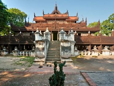 Shwe Inbin Monastery, MandalayFull day guided tour to Amanpura, Ava & Sagaing: After breakfast, leave Mandalay for Amarapura, 10 miles out of the city, to visit Mahagandayon Monastery where more than a thousand monks live and study. Time permitting you will have the opportunity to observe the monks having their last meal of the day in total silence. Continue to the 200 year old U Bein teak bridge which was built in 1782 at the time when Amarapura was the capital. The Bagaya Monastery will fascinate you with its intriguing collection of Buddha statues. This afternoon a short drive brings you to Myitnge River for the short boat trip across the river to the former Royal Capital of Inwa (Ava) where a horse-drawn carriage is waiting. You will visit Nanmyint Watch Tower, the remains of a palace building nicknamed "the leaning tower of Ava"; the Maha Aungmye Bonzan Monastery, built of brick and stucco and Bargayar Monastery, famous for its ornate woodcarvings and teak posts. Today's excursion ends with a visit to the Sagaing Hills, a retreat for Buddhist devotees, in time for sunset.