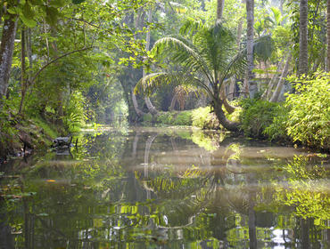 Cruise through the backwaters: After boarding, you will set off from Alleppey to enjoy a cruise through the backwaters of Kerala. Around an hour later lunch will be served - a spread of delicious local cuisine - and after lunch your houseboat will continue meandering slowly through the tranquil network of water canals, dotted with busy hamlets and lush green paddy fields. A houseboat ride through these placid backwaters is a wonderfully relaxing experience, a perfect opportunity to put your feet up and watch the world glide silently by. Towards the end of the afternoon, you will have the option of transferring to smaller rowboat, which will take you deeper into the narrow canals which are unnavigable for larger houseboats. Taking this route allows you to get deeper into the lush, bucolic scenes, passing through tranquil hamlets and observing the rural lifestyles.